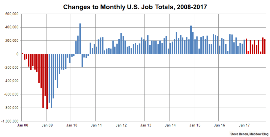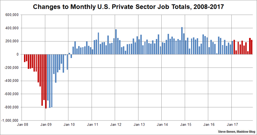 Above you’ll find the chart I run every month, showing monthly changes in total jobs since the start of the Great Recession. The image makes a distinction: red columns point to monthly changes under the Bush and Trump administrations, while blue columns point to monthly job changes under the Obama administration.