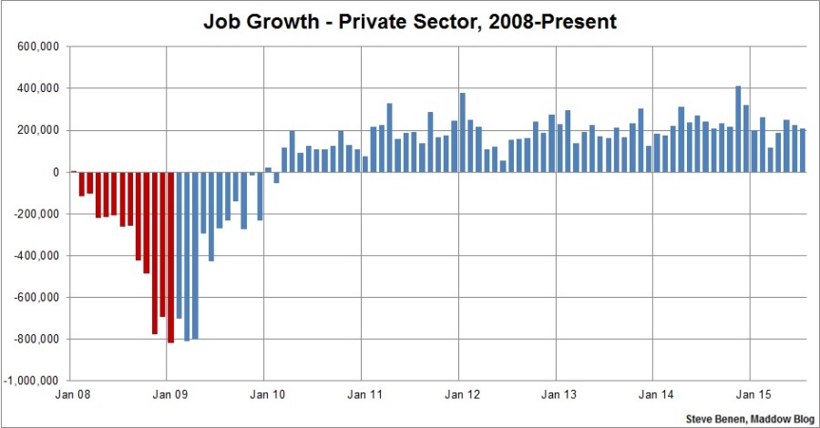 I can appreciate why job totals like these seem a little dull. Lately, it seems most monthly reports on jobs show roughly the same thing: growth around +200k and low unemployment. But let’s not take good news for granted, because it wasn’t that long ago that the country was desperate for news like this. What’s ho-hum in August 2015 would have produced dancing in the streets in August 2009.