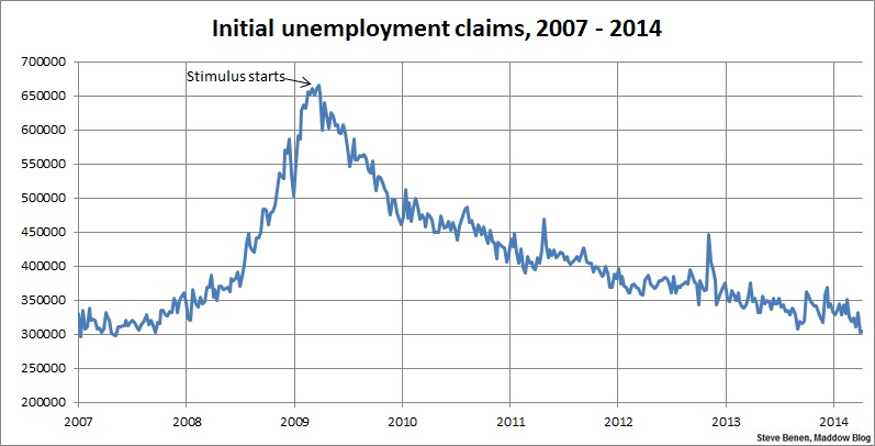 Above you’ll find the chart showing weekly, initial unemployment claims going back to the beginning of 2007. (Remember, unlike the monthly jobs chart, a lower number is good news.) For context, I’ve added an arrow to show the point at which President Obama’s Recovery Act began spending money.