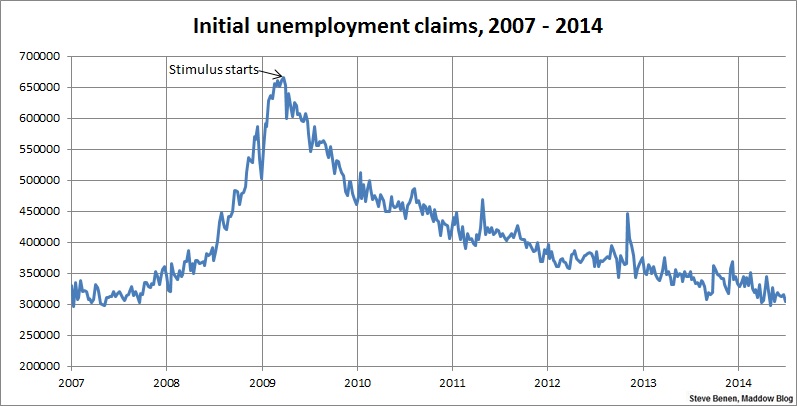 Above you’ll find the chart showing weekly, initial unemployment claims going back to the beginning of 2007. (Remember, unlike the monthly jobs chart, a lower number is good news.) For context, I’ve added an arrow to show the point at which President Obama’s Recovery Act began spending money.