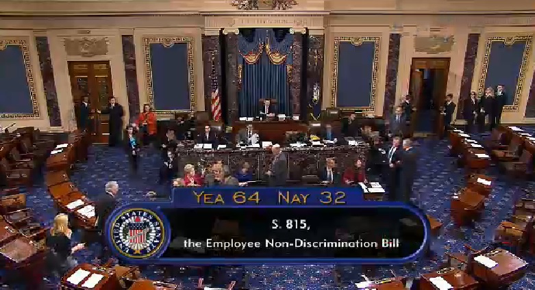 Senate lawmakers on Thursday passed a bill banning workplace discrimination against LGBT individuals in a historic, albeit nominal, victory four decades in the making.The Employment Non-Discrimination Act (ENDA) passed its final vote in the full Senate 64-32, just three days after its first since 1996, when a similar measure failed but just one vote.