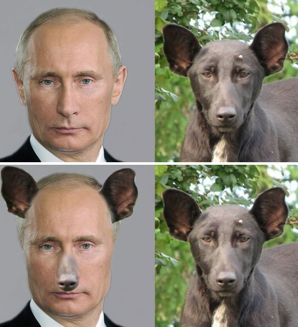Lastly, I mentioned spending a lot of time with Tricia trying to figure out how best to show the Putin/dog similaries, at one point actually grafting the dog’s features onto the Putin photo to try to figure out what the heck made them look so similar. Ultimately the decision was made to just fade between them. Here’s what it looks like with the dog features added but I still can’t figure out where the resemblance comes from. Maybe it’s the shape of the top of the head?