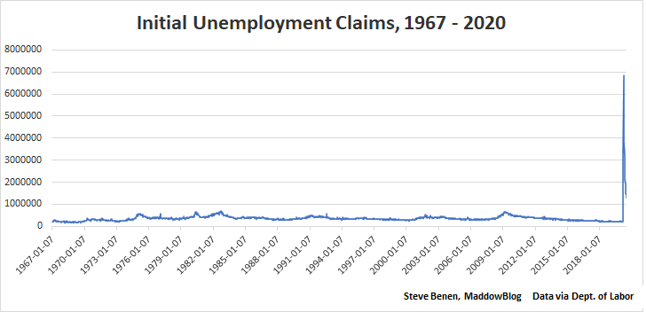 But as we’ve discussed, looking at historical data, we know what things look like when there’s an economic crisis. In early 2009, for example, near the height of the Great Recession, initial jobless claims reached 665,000 — roughly triple the totals from, say, a couple of months ago. During the U.S. recession in 1982, the number was a little higher, reaching nearly 700,000.