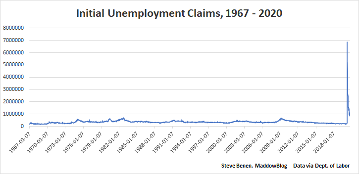 The cumulative effects continue to matter: these 860,000 Americans who’ve just filed for jobless benefits are in addition to the totals from the last several weeks. In other words, we’ve seen more than 60 million initial unemployment claims filed since mid-March — a total unlike anything the country has seen in modern times.