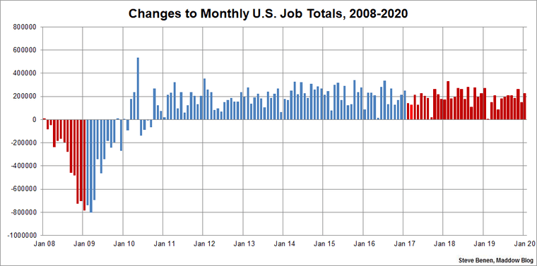 Above you’ll find the chart I run every month, showing monthly changes in total jobs since the start of the Great Recession. The image makes a distinction: red columns point to monthly changes under the Bush and Trump administrations, while blue columns point to monthly job changes under the Obama administration.