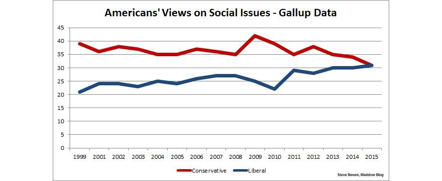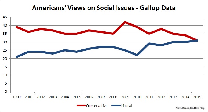 Thirty-one percent of Americans describe their views on social issues as generally liberal, matching the percentage who identify as social conservatives for the first time in Gallup records dating back to 1999. […]The broad trend has been toward a shrinking conservative advantage, although that was temporarily interrupted during the first two years of Barack Obama’s presidency. Since then, the conservative advantage continued to diminish until it was wiped out this year.