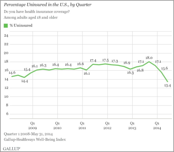 The fact that the drop leveled off between April and May is not surprising — the fact that general enrollment through ACA exchange marketplaces has ended was expected to produce these results. Indeed, the data actually reinforces confidence in Gallup’s accounting.
