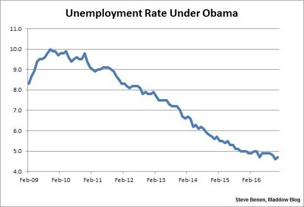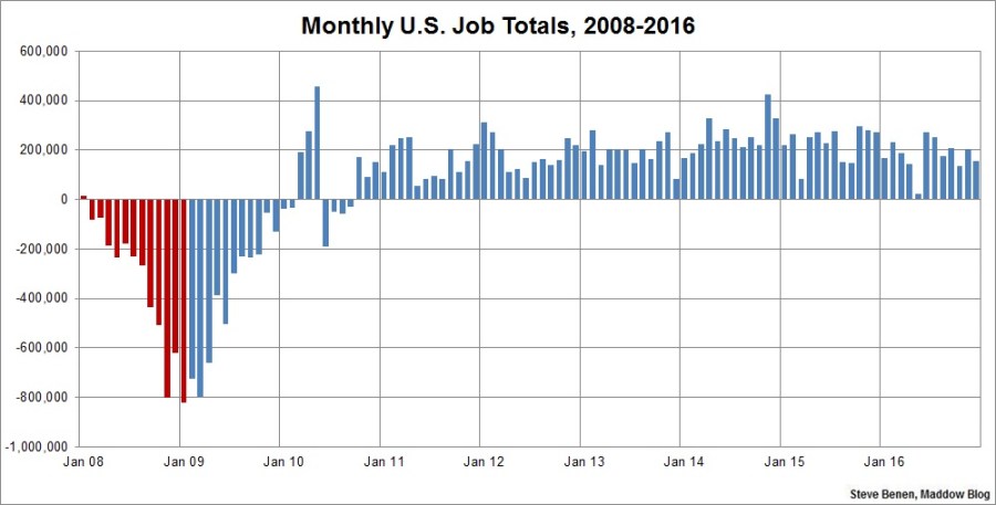 President Obama won’t leave office for another two weeks, but this morning brought the final jobs report of his second term. It offered the latest in a series of reminders that the president is handing off a healthy economy to his successor (who spent 2016 telling voters the economy is terrible).The Bureau of Labor Statistics reported this morning that the U.S. economy added 156,000 jobs in December. The unemployment rate, meanwhile, remains low, inching higher from 4.6% to 4.7%. It’s the 15th consecutive month the rate has been at 5% or lower. (Remember when Mitt Romney said he might be able to get the jobless rate down to 6% by the end of his first term? I do.)As for the revisions, October’s and November’s job totals were both revised up, adding a net gain of 19,000.Also of interest, this report showed a larger-than-expected hike in average hourly earnings, suggesting not only that job growth is steady, but American wages are improving, too.Though the latest data still faces some revisions, the preliminary estimates now show the overall economy added 2.15 million new jobs in 2016, which is a pretty healthy number. What’s more, December was the 75th consecutive month of positive job growth, which is the longest on record.Remember, as we discussed last month, as far as Republicans are concerned, results like these were completely impossible. For the right, the combination of the Affordable Care Act, higher taxes, and assorted regulations would stifle job growth and push the economy into a recession, but the exact opposite happened. Nevertheless, Donald Trump and GOP lawmakers believe they’ll “get the economy moving” by undoing the policies that brought us to this point.We’ll see how that works out.Above you’ll find the chart I run every month, showing monthly job losses since the start of the Great Recession. The image makes a distinction — red columns point to monthly job totals under the Bush administration, while blue columns point to job totals under the Obama administration.Update: Here’s another chart, this one showing monthly job losses/gains in just the private sector since the start of the Great Recession.