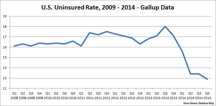 As we discussed a couple of weeks ago, the sharp improvement in the uninsured rate comes against the backdrop of a strong open-enrollment period and a whole host of related reports, including encouraging data on premiums, customer satisfaction rates, the lowest increase in health care spending in 50 years, the growing number of insurers who want to participate in exchange marketplaces, high enrollment totals with consumers who paid their premiums, the efficacy of Medicaid expansion, the efficacy of the medical-loss ratio, and reduced medical errors system-wide.