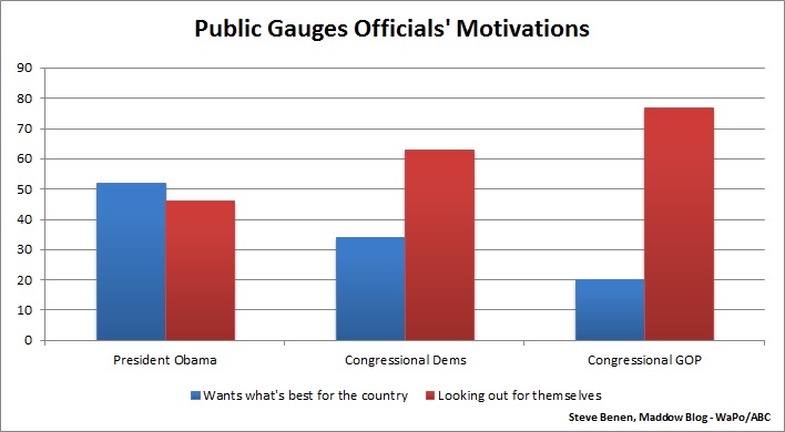 The results cover quite a bit of ground, but there was one question in particular that stood out for me: respondents were asked whether they believe the various officials in Washington are more interested in doing what’s best for the country or what’s best for themselves politically. It’s an interesting question because it speaks to something that isn’t often polled: perceptions of motivations.
