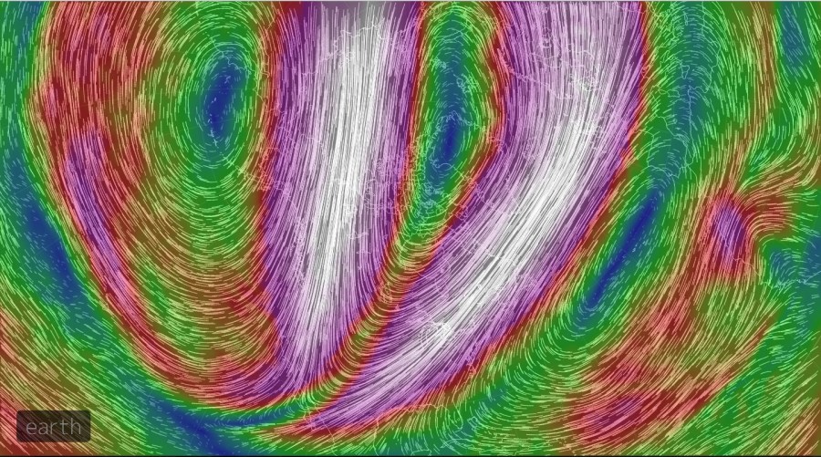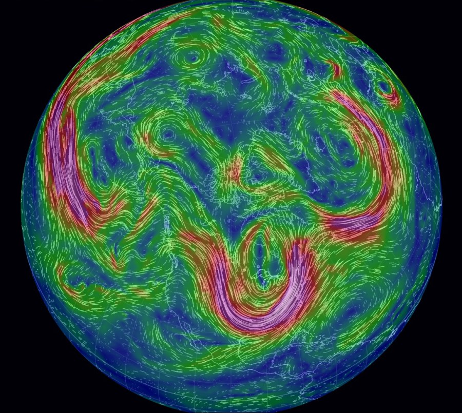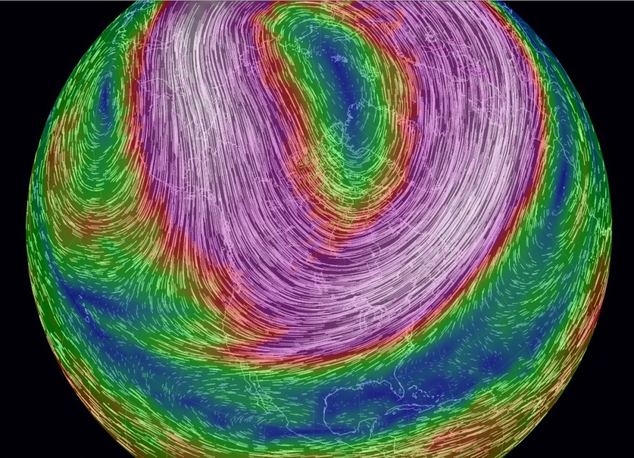 A few of the explanations I read talked about this week’s cold being the result of a weakening of the vortex, possibly caused by heat from the summer ice melt. Would that stripe of slower wind speed breaking the loop over the Midwest be representative of that weakening?