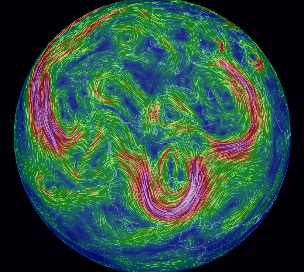 What I want is to see it, so I’m using a map called, I think, earth, built by a web developer named Cameron Beccario, who was inspired by the Wind Map we last looked at here in the lead-up to Hurricane Sandy. But Beccario has taken the Wind Map to a whole new level by offering it world-wide on a variety of map layouts and with options for different altitudes and dates. The data, drawn from NCEP, the National Weather Service, and NOAA, updates every three hours.