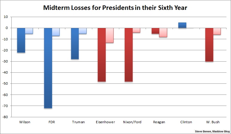 I put together this chart showing every sixth-year administration of the last century and how their party fared in the congressional midterms. Blue columns are for Democratic administrations; red columns are for Republican administrations. The darker color shows House losses; the lighter color shows Senate losses. (I went ahead and combined Nixon and Ford since Ford was sworn in during Nixon’s sixth year, just a few months before the 1974 midterms.)