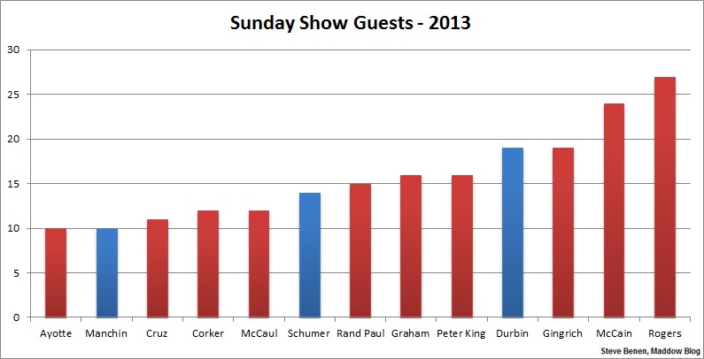 The general impression is rooted in fact: the Sunday shows love Republicans. “Meet the Press,” “Face the Nation,” “This Week,” “State of the Union,” and “Fox News Sunday,” hoping to reflect and help shape the conventional wisdom for the political world, collectively favor GOP guests over Democratic guests every year, but who were the big winners in 2013?