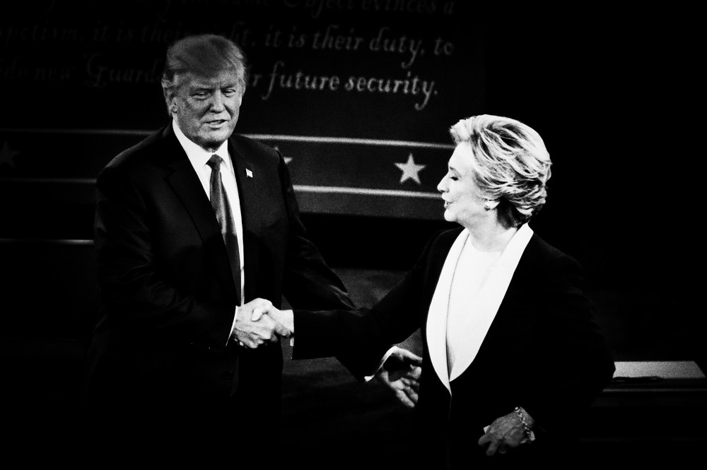 Presidential nominees Donald Trump and Hillary Clinton shake hands at the close of the second presidential debate at Washington University in St. Louis, Mo., Oct. 9, 2016.Mark Peterson/Redux for MSNBC