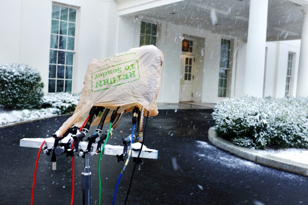 Television microphones are protected by a plastic bag as heavier snow begins to fall outside the West Wing of the White House in Washington, on Jan. 21, 2014.AP