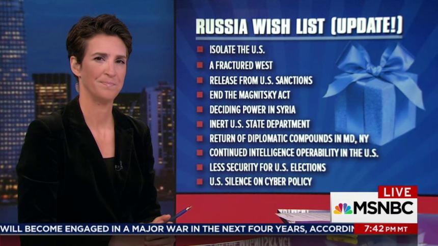 This wasn’t an isolated development. As we discussed last week, Trump has also tried to weaken sanctions, isolated the United States diplomatically, fractured Western alliances, diminished the influence of the State Department (which is now led by Putin’s closest American ally), and largely ignored Russia’s attack on the U.S. elections — all of which serve Moscow’s strategic goals. As Rachel noted on Tuesday’s show, the list of actions in D.C. that Putin is certain to like keeps growing.