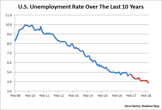 And finally, whenever this president brings up the unemployment rate, I’m reminded of campaign rhetoric on this subject. Indeed, just months before Election Day 2016, with the unemployment rate dropping below 5% for the first time in years, Trump insisted that the public not believe it.