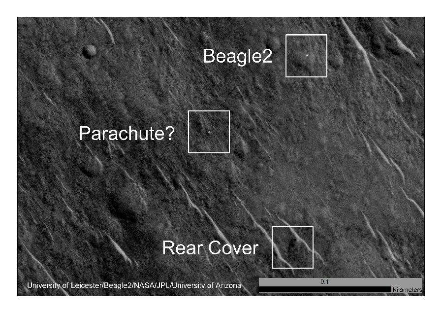 Images taken in December by NASA’s HiRISE instrument aboard the Mars Reconnaissance Orbiter seem to show the Beagle 2 lander on the surface of Mars, with its solar arrays only partially deployed. Fully deployed, the lander would only be 2 meters across, which is just at the edge of the detection capabilities of HiRISE. Analysts have determined that the location of the object in question is close to the intended landing site (within 3 miles) and the structure appears to be of the right size, shape, and color that would be detected at such a distance. There’s even a possibility that additional spots on the surface could be the landers parachute and rear cover.