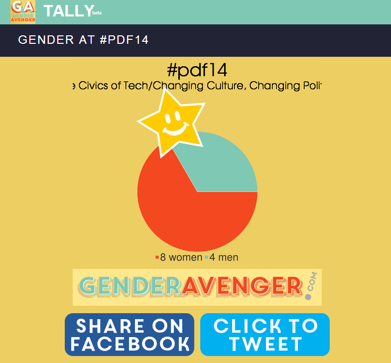A new group called Gender Avenger offers another option: they are launching a new gender tally tool to allow women to publicly speak out on social media about a conference’s gender ratio. The GenderAvenger Tally allows conference attendees to enter the name and hashtag of the conference they are attending, the number of male speakers, and the number of female speakers. The calculator generates a pie chart displaying the speaker gender ratio at the conference, and allows users to share the chart on Facebook and Twitter using the conference hashtag as well. The group’s goal is to encourage conference attendees to publicly call attention to events that have largely male speaker lineups, in the hopes that organizers will respond and create more gender-diverse events in the future.