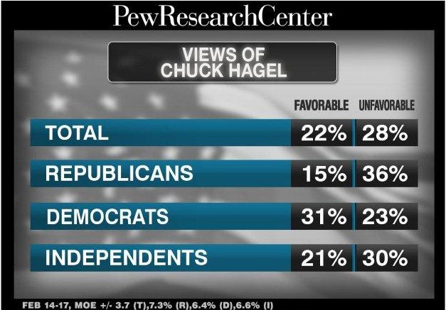 New polling from the Pew Research Center shows that Hagel’s favorable ratings have slid over the past month, as he has become better known, and been battered by an ugly confirmation battle. A month ago, 18% of Americans had a favorable view of Hagel, 17% viewed him unfavorably and nearly two-thirds (65%) had no opinion.