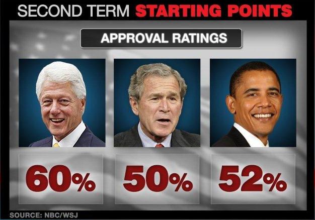 President Obama has maintained a good part of his personal popularity throughout his first term, yet faces widespread skepticism as he heads into his second. Looking back at the most recent two-term presidents, NBC News and the Wall Street Journal found that the country’s mood and opinion of the commander-in-chief today are remarkably similar to polling conducted on the eve of George W. Bush’s second inaugural in 2005. Back then, 40% said the country was headed in the right direction while 47% said it was on the wrong track. President Obama faces negative numbers as well – just 35% say America is headed in the right direction while 57% picked “wrong track”. Obama’s approval number is 52%, Bush’s was 50% and their disapproval numbers are identical (44%).
