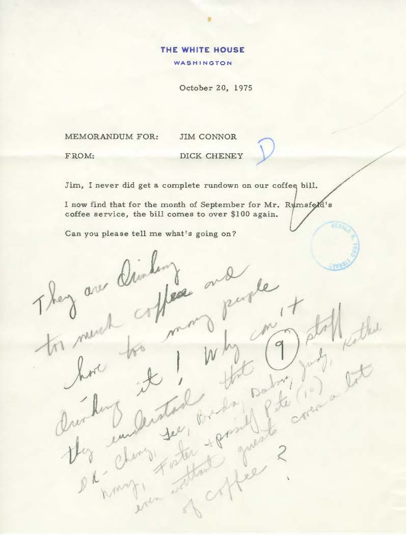 If you woke up this morning wondering what former Vice President Dick Cheney was doing on this day 39 years ago, you’re in luck. We know what he was doing on October 20, 1975, thanks to the Gerald R. Ford Presidential Library and Museum. On this day in Cheney history, Dick Cheney, who was then the Deputy Chief of Staff, sent a memo to White House Staff Secretary Jim Connor about then-White House Chief of Staff Donald Rumsfeld’s excessive coffee bill.