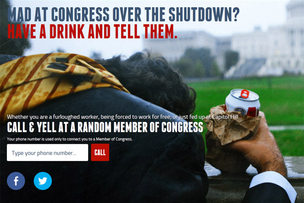 Drunkdialcongress.org, launched by the mobile ad firm Revolution Messaging, invites visitors to “have a drink” and “call and yell at a random member of Congress.” By entering in their phone number, users are then called back by the site through a 1-800 number and connected to a Capitol Hill office. What happens next is up to you.