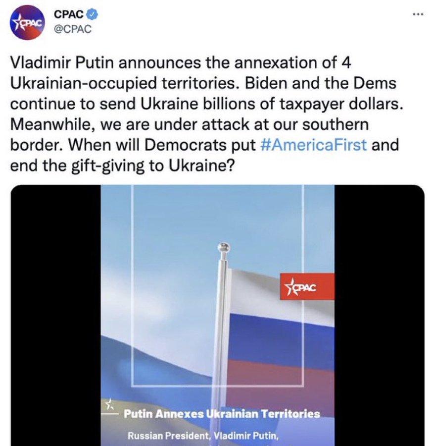 In a since-deleted tweet, CPAC claimed Russian President Vladimir Putin had announced the annexation of four “Ukrainian-occupied territories,” which, to be clear, are lands internationally recognized as belonging to Ukraine. The U.S. has adamantly refused to acknowledge Russia’s annexation of the territories (which already seems to be falling apart) as legitimate. CPAC seemed to disagree with that position. The tweet accused “Democrats” of “gift-giving” to Ukraine, seemingly a reference to aid the Biden administration has authorized for the country amid the Russian invasion.