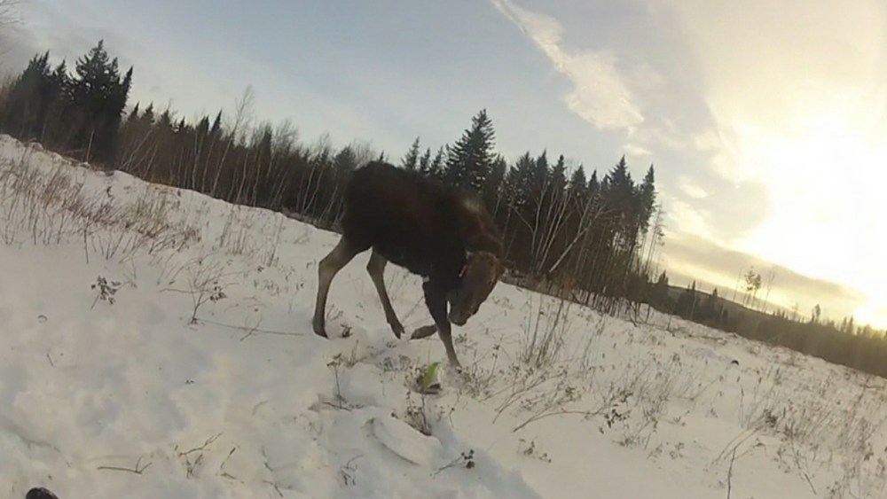 Man films being beat up by baby moose