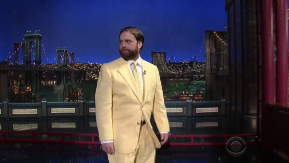 Zach Galifianakis gets caught in downpour in Letterman green room /